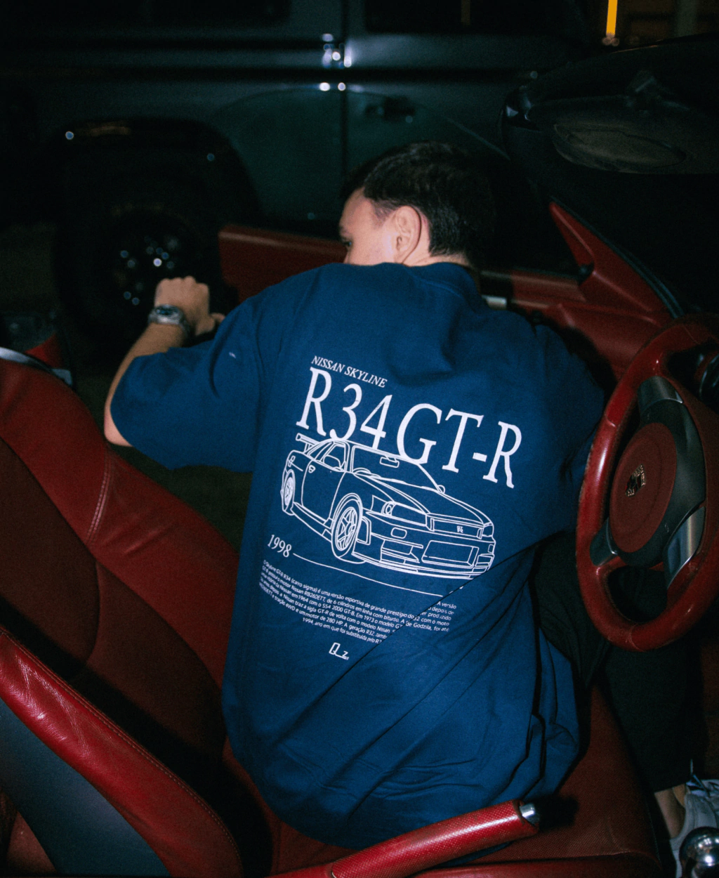 Palavras-chave: Camiseta Nissan Skyline R34, camiseta vintage automotiva, moda automotiva, camiseta oversized de carros, camiseta Skyline GT-R, estilo clássico japonês.